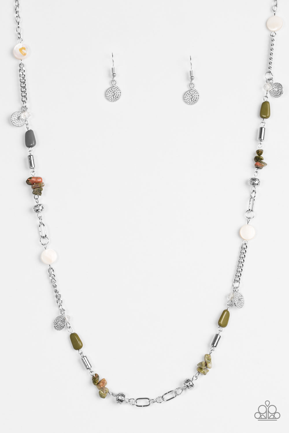 Brushed in shell-like iridescence, bits of green, brown, and white stone beading trickles along a shimmery silver chain. Mismatched silver accents are sprinkled between the earthy accents for a seasonal finish. Features an adjustable clasp closure.