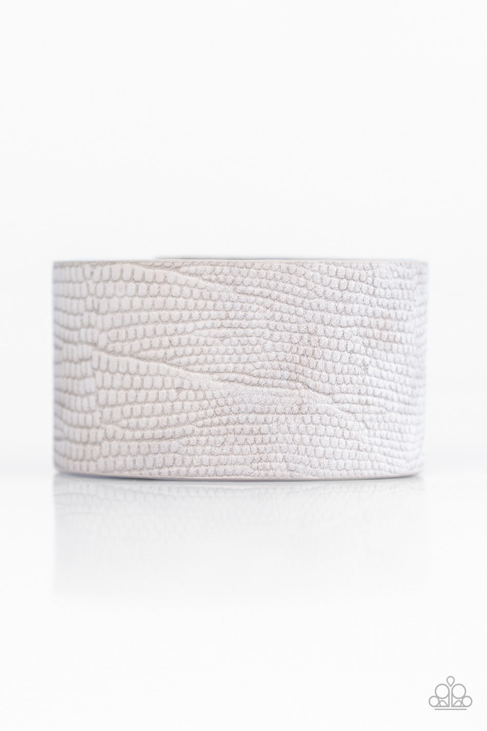 Stamped in snakeskin-like texture, a soft leather band wraps around the wrist in a fierce fashion. Features an adjustable snap closure.
