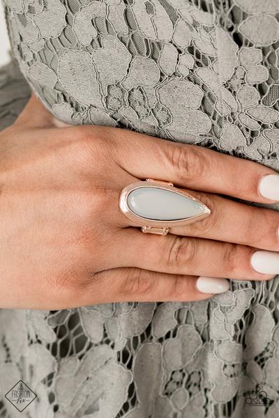 Featuring an opalescent shimmer, a tranquil white bead is pressed into the center of a hammered rose gold teardrop frame for an ethereal vibe. Features a stretchy band for a flexible fit.