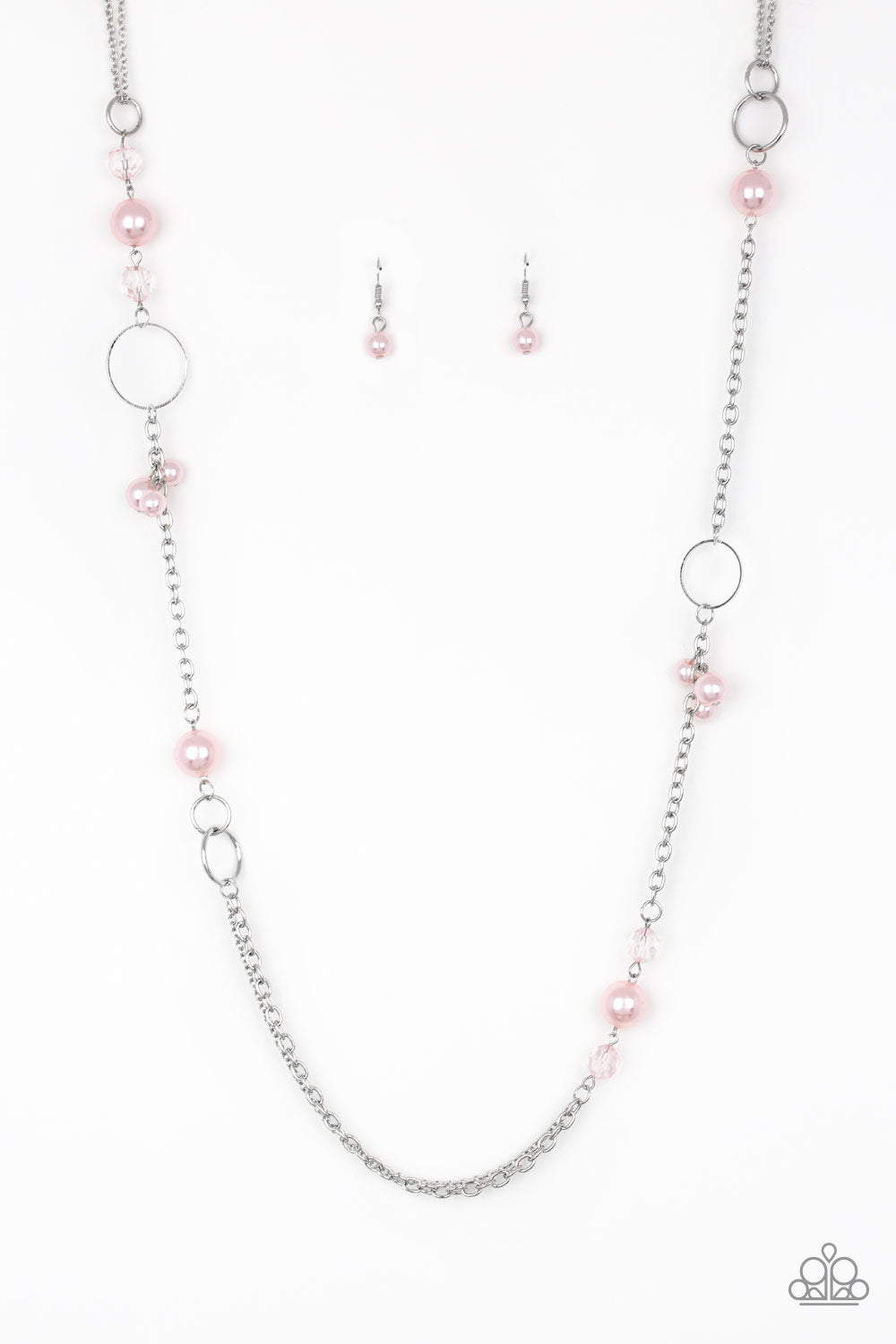 A collection of glistening silver hoops, glassy pink beads, and pearly pink beads trickle along a shimmery silver chain for a refined look. Features an adjustable clasp closure.