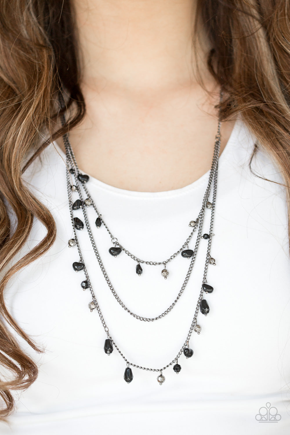 Faceted gunmetal and black beads join shiny black pebbles along glistening gunmetal chains, creating refined layers across the chest. Features an adjustable clasp closure.