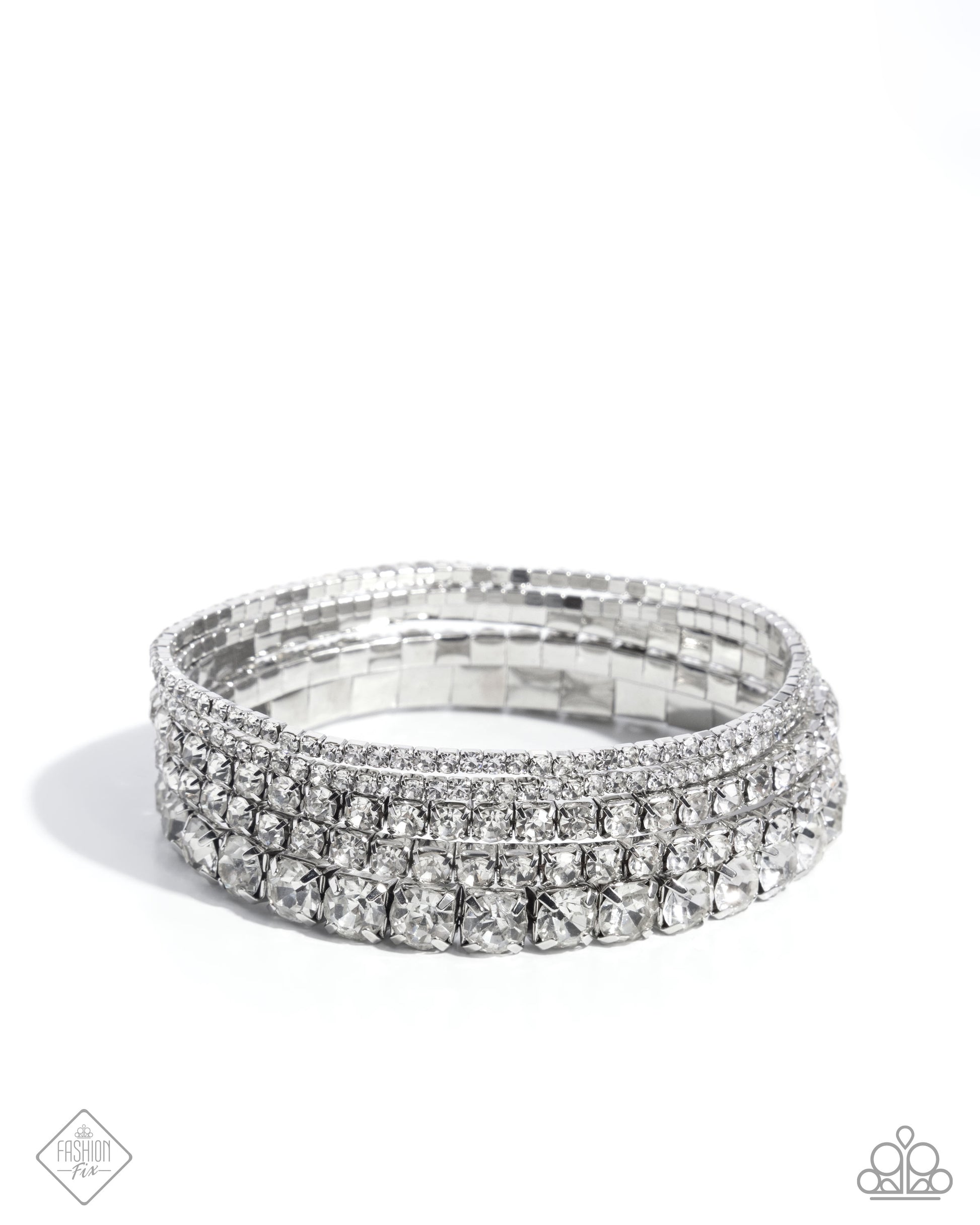 Threaded along invisible stretchy bands, a collection of silver bracelets featuring rows of sparkling white rhinestones stack along the wrist. The luxurious design adds a dazzling and elegant touch to any look.