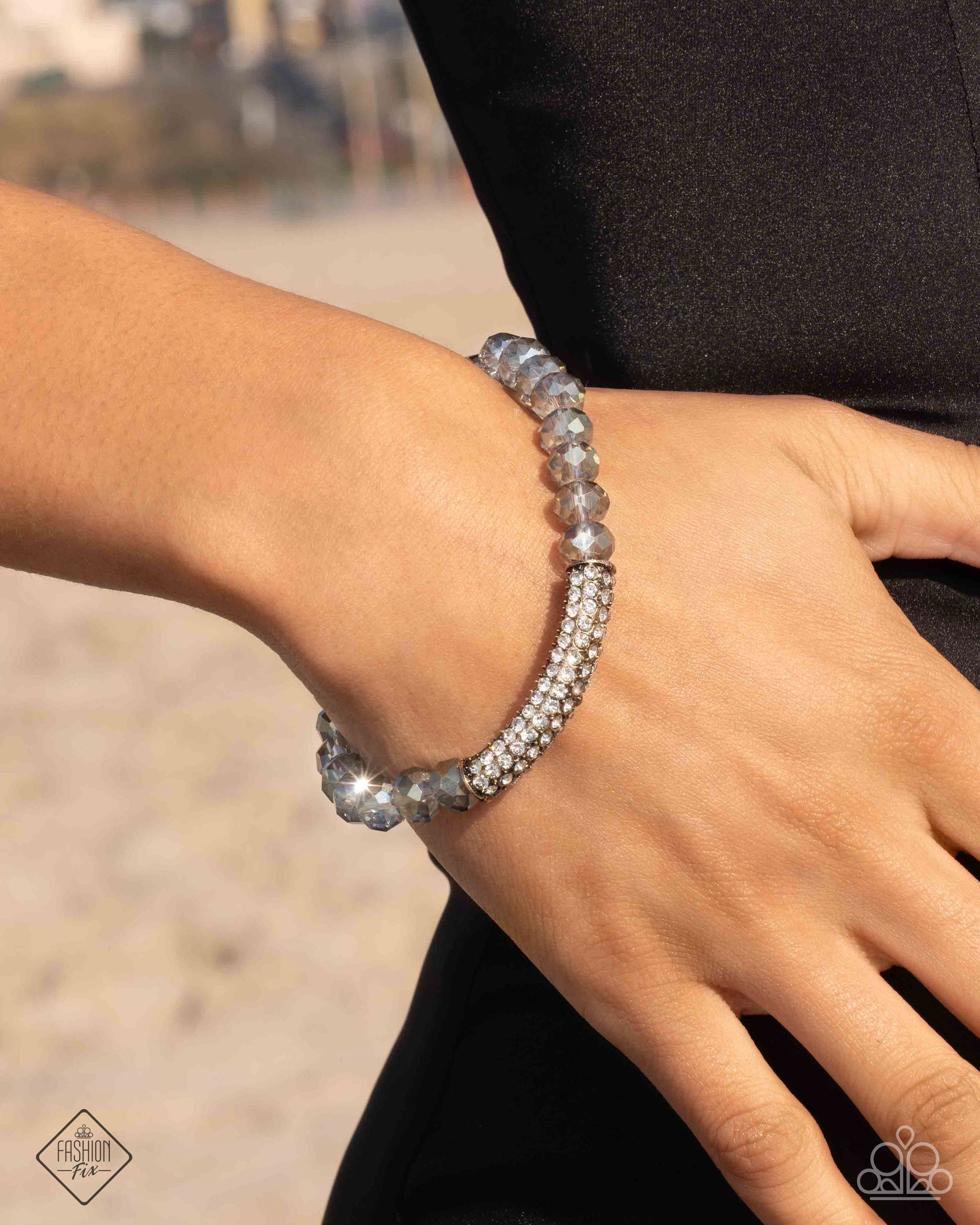 Infused along an elastic stretchy band, a collection of transparent smoky UV shimmery faceted beads pattern and frame a curved antiqued gold accent dusted in glistening white rhinestones for a uniquely radiant display.