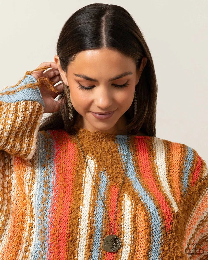 An asymmetrical brass pendant with an antiqued finish, glides at the bottom of a dainty brass chain. Stamped on the pendant, the phrase "Bloom where you're planted" stands out on the asymmetrical surface in a curly, script font. Tactile, brass flowers bloom next to the phrase for a floral finish. Features an adjustable clasp closure.