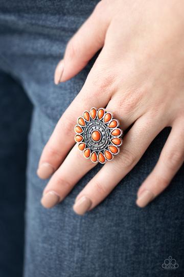 A collection of orange beaded petals flare out from a textured silver center, creating a whimsical flower atop the finger. Features a stretchy band for a flexible fit.