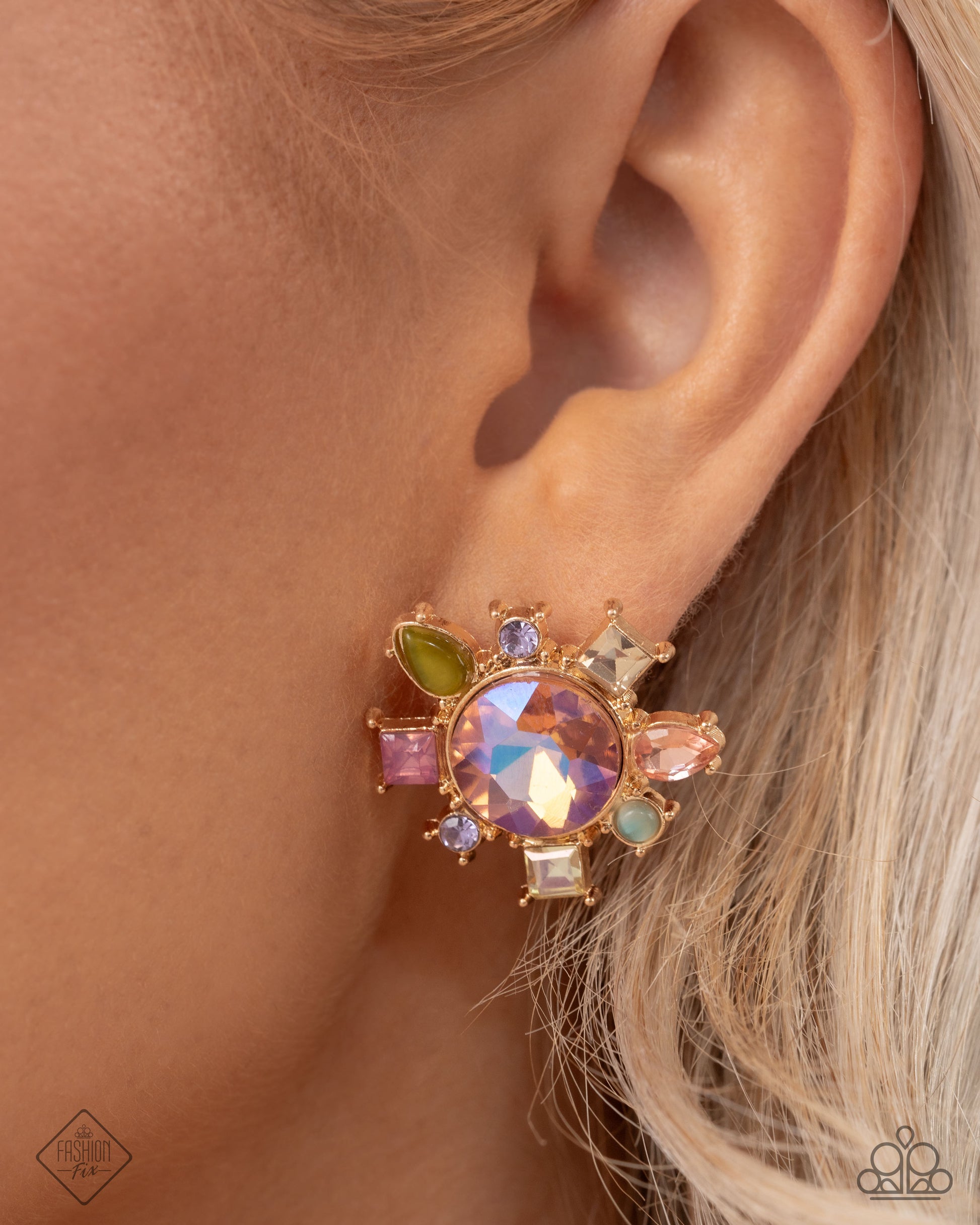 Crackling with vintage incandescence, a sparkly collection of round, teardrop, and square gems and rhinestones in varying shades and opacities scatters around an oversized UV-shimmery peach gem in gold-pronged fittings for a jaw-dropping dazzle. Due to its prismatic palette, color may vary. Earring attaches to a standard post fitting.