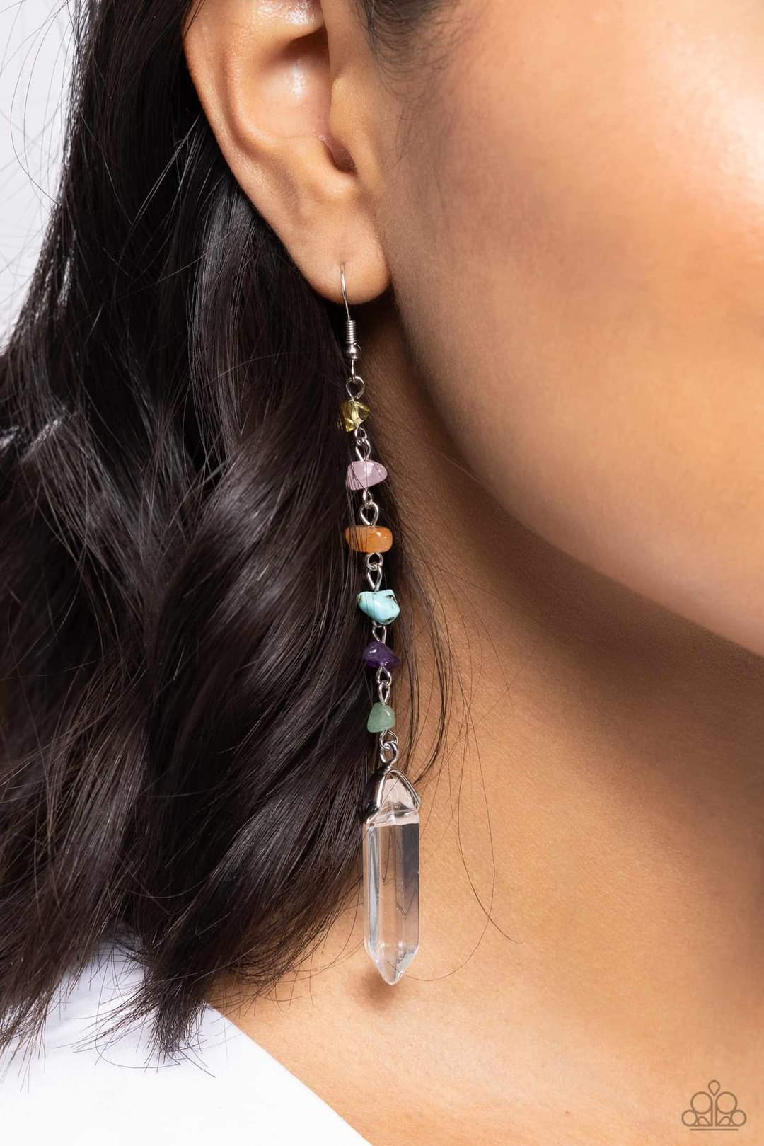 Chiseled multicolored stones connect down the ear along a silver chain, leading the eye to a clear quartz-like piece at its end for an elegantly earthy lure. Earring attaches to a standard fishhook fitting. As the stone elements in this piece are natural, some color variation is normal.