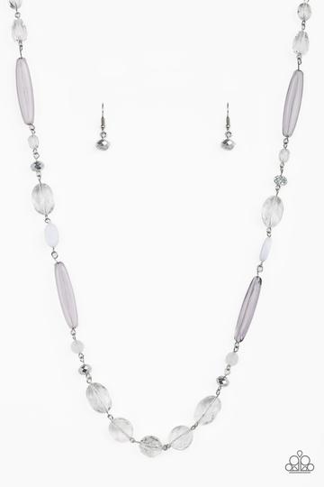Varying in shape and shimmer, faceted white and metallic crystal-like beads trickle down the chest for a whimsical look. Features an adjustable clasp closure.