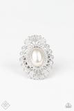 A pearly white bead is pressed into the center of an oversized silver frame swirling with ornate filigree and blinging white rhinestones. Features a stretchy band for a flexible fit.