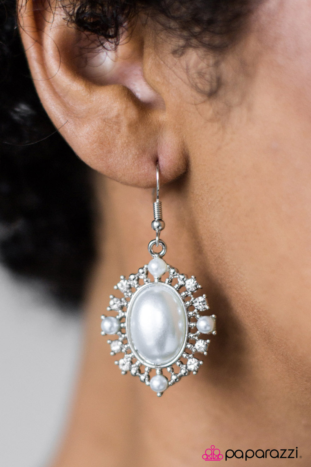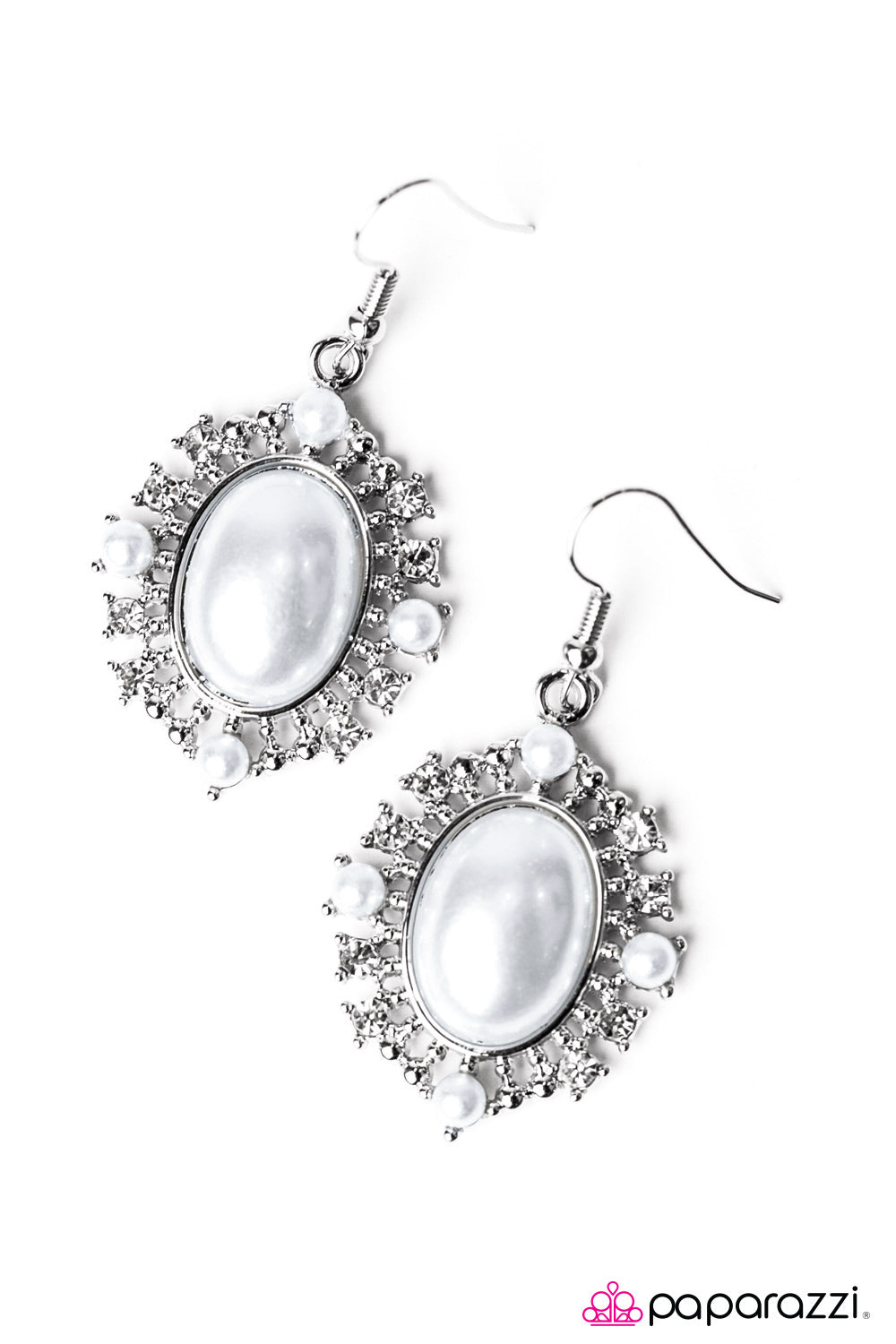 Glistening silver bars fan out from a pearly silver center, creating an ornate frame. Dainty white rhinestones and silver pears are sprinkled along the silver frame, adding a classic finish to the romantic palette. Earring attaches to a standard fishhook fitting.