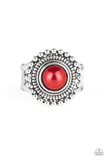 A pearly red bead is pressed into a round silver frame radiating in shimmery studded detail for a refined look. Features a stretchy band for a flexible fit.