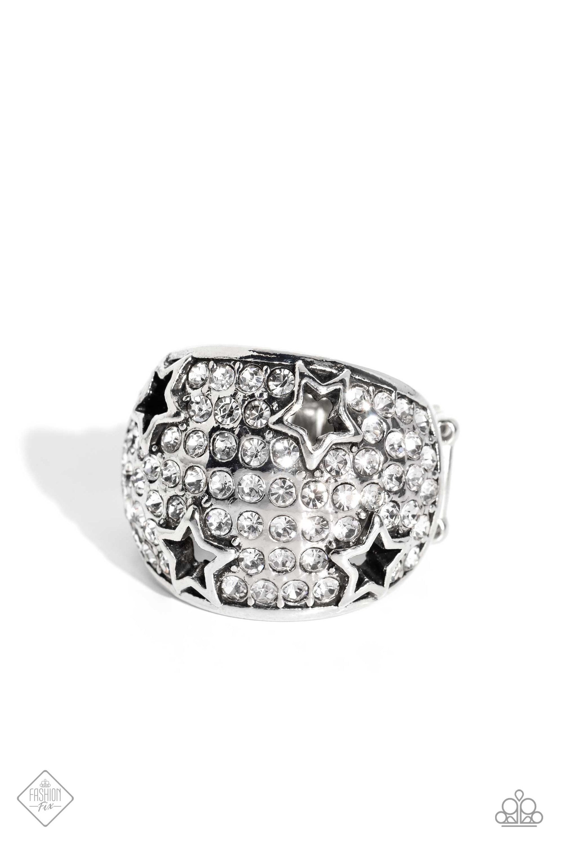 Row after row of incandescent white rhinestones stack into a dazzling display across a beveled silver band. Silver star silhouettes haphazardly dot across the dazzling surface, creating a commanding statement piece. Features a stretchy band for a flexible fit.