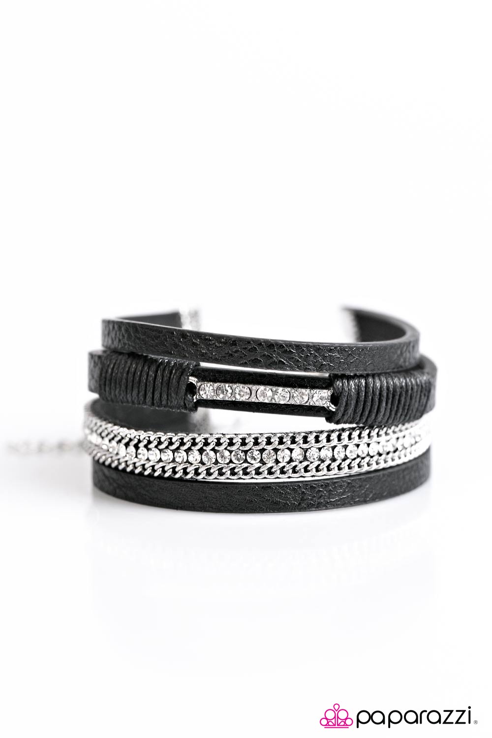 Connected to large silver accents, strands of black leather stack across the wrist. Silver chain and dazzling white rhinestones are added to the neutral palette, creating a sassy layered arrangement. Features an adjustable clasp closure.