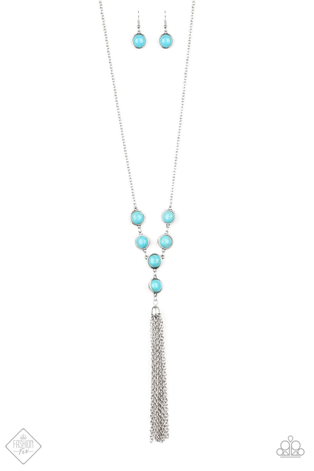 Refreshing turquoise stone frames link at the bottom of a lengthened silver chain, giving way to a shimmery silver chain tassel in a wanderlust finish. Features an adjustable clasp closure.