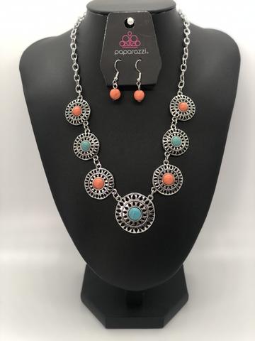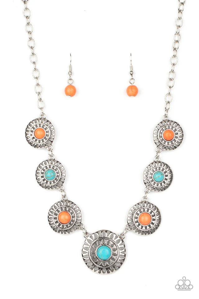 Featuring shiny silver discs linked with bubbly orange and mosaic blue stones framed below the collar, creating a colorful statement piece. Features an adjustable clasp closure.