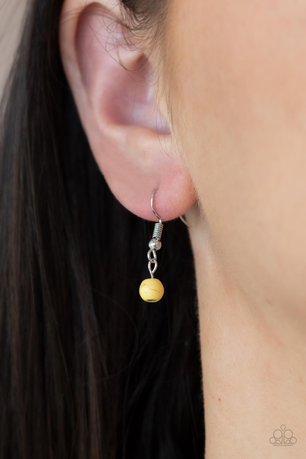 A mismatched collection of brown wooden beads, turquoise pebbles, hammered silver ovals, and dainty multicolored stone beads haphazardly adorned sections of silver chain across the chest, creating an earthy seasonal flair. A lobster clasp hangs from the bottom of the design to allow a name badge or other item to be attached. Features an adjustable clasp closure.