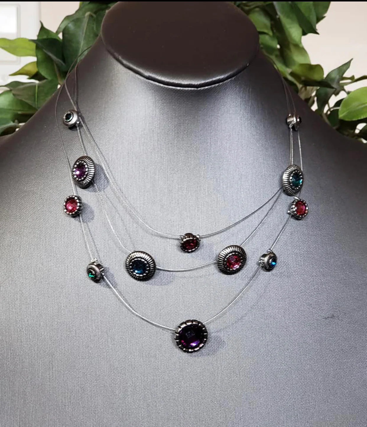 Dotted with pink, blue, purple rhinestone centers, an array of ornate silver frames trickle along skinny silver wires below the collar for a whimsical flair. Features an adjustable clasp closure.