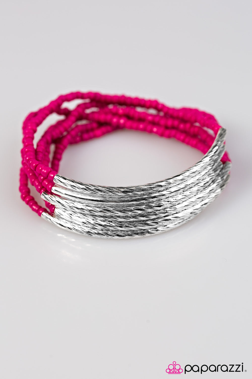 Dainty pink seed beads are threaded along stretchy elastic bands, creating colorful layers. Shimmery silver rods are added, creating flashy metallic centerpieces.