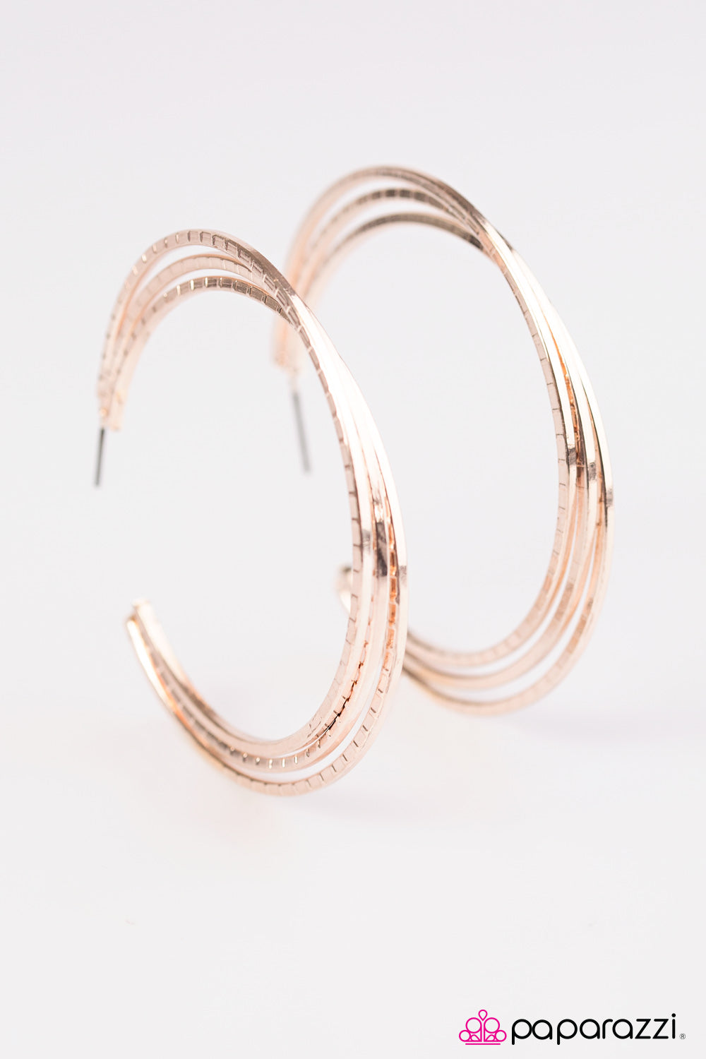 Etched in shimmery textures, three rose gold hoops subtlety twist into a casual hoop. Earring attaches to a standard post fitting. Hoop measures 2" in diameter.