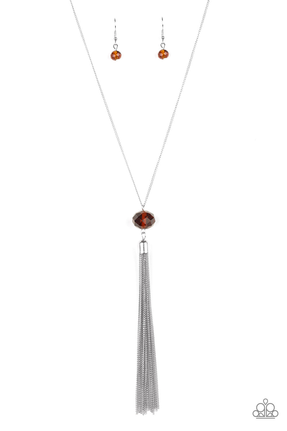 A glittery brown crystal-like bead swings from the bottom of a lengthened silver chain, giving way to a shimmering silver tassel for a glamorous finish. Features an adjustable clasp closure.