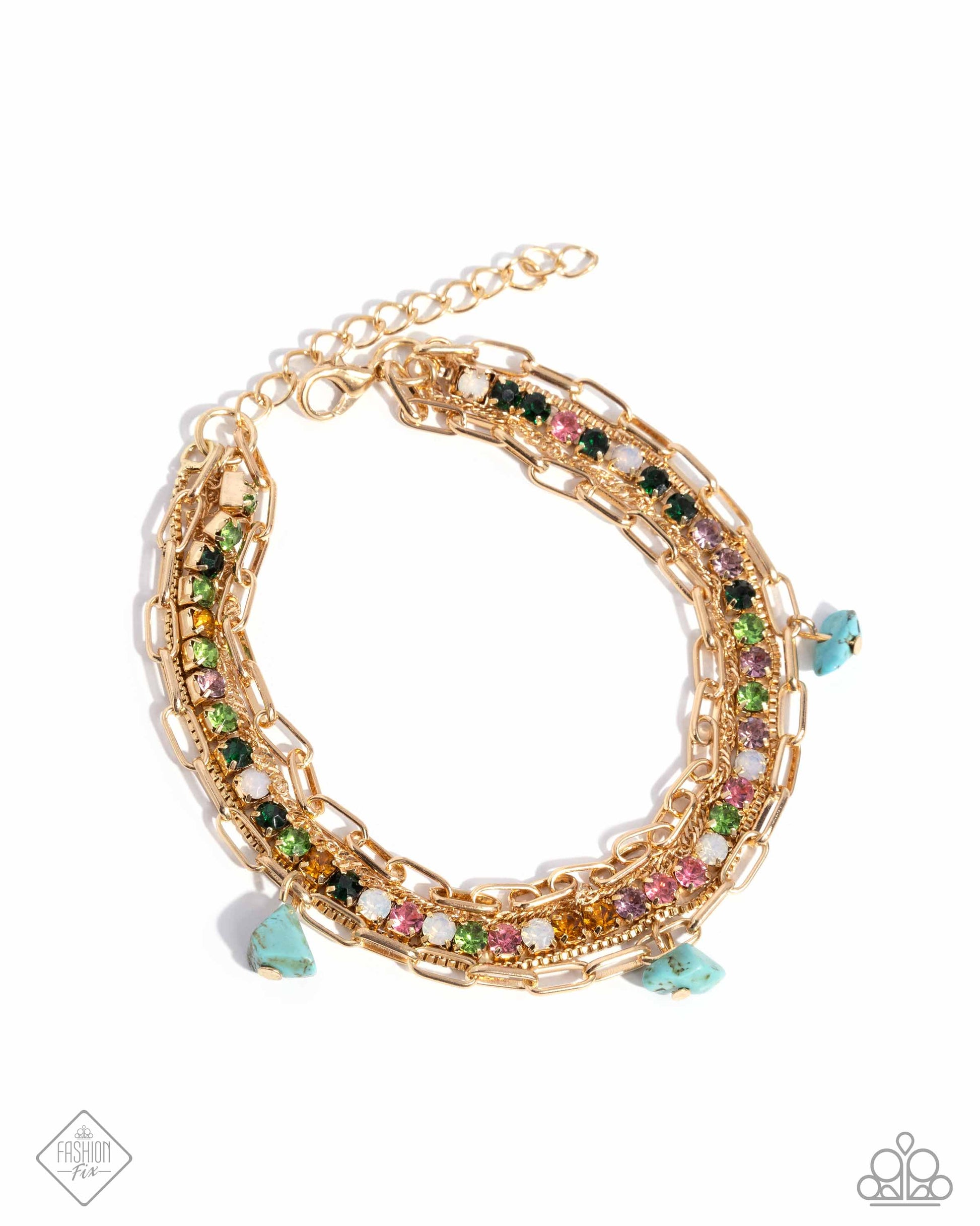 Set in square gold fittings, a strand of sparkly multicolored and opalescent rhinestones layer around the wrist. Infused with dainty box, paperclip, and singapore gold chains, the sparkly rows stack into an expressive shimmer. A chiseled trio of turquoise stones randomly sway along the lowermost paperclip chain for additional earthy, eclectic detail. Features an adjustable clasp closure. As the stone elements in this piece are natural, some color variation is normal.
