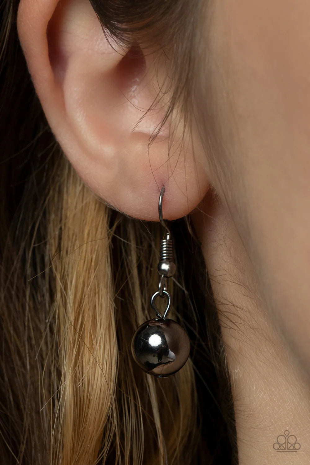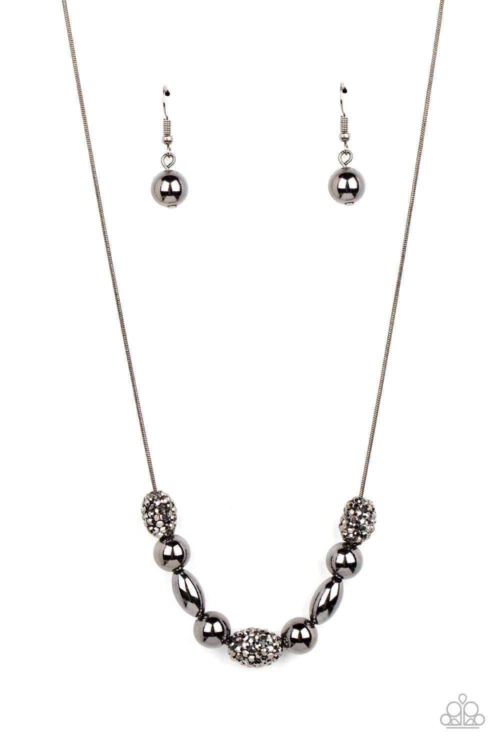 A gritty collection of round gunmetal, hematite rhinestone encrusted, and round oval beads glide along a rounded gunmetal snake chain, creating a glitzy display below the collar. Features an adjustable clasp closure.