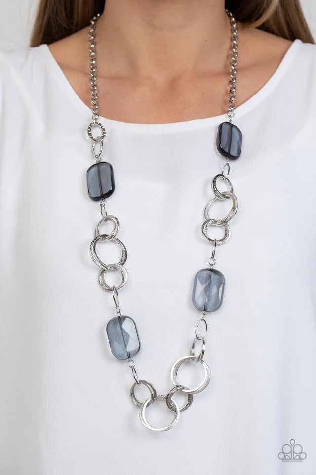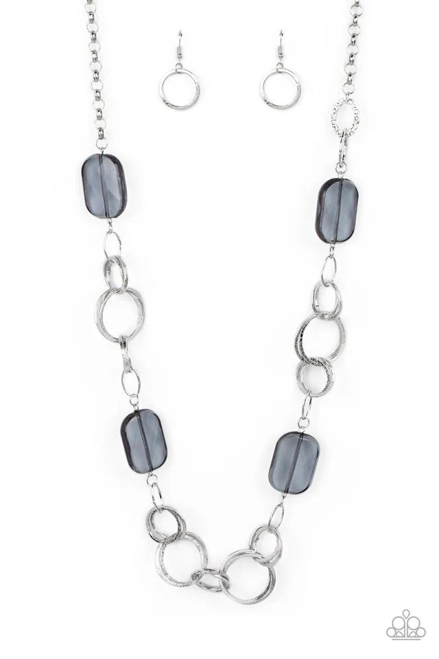 Featuring a faceted shimmer, oversized smoky beads give way to sections of delicately hammered silver hoops across the chest for a colorful flair. Features an adjustable clasp closure.