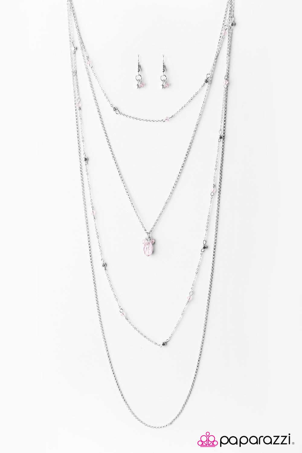 Dainty silver cube beading and glittery pink crystal beading trickles along trestles of shimmery silver chain, creating colorful layers. A cluster of pink crystal beads swings from the uppermost chain, creating a whimsical pendant. Features an adjustable clasp closure.