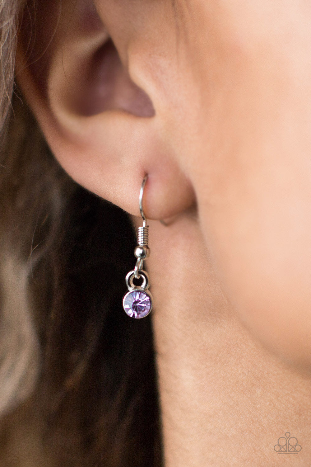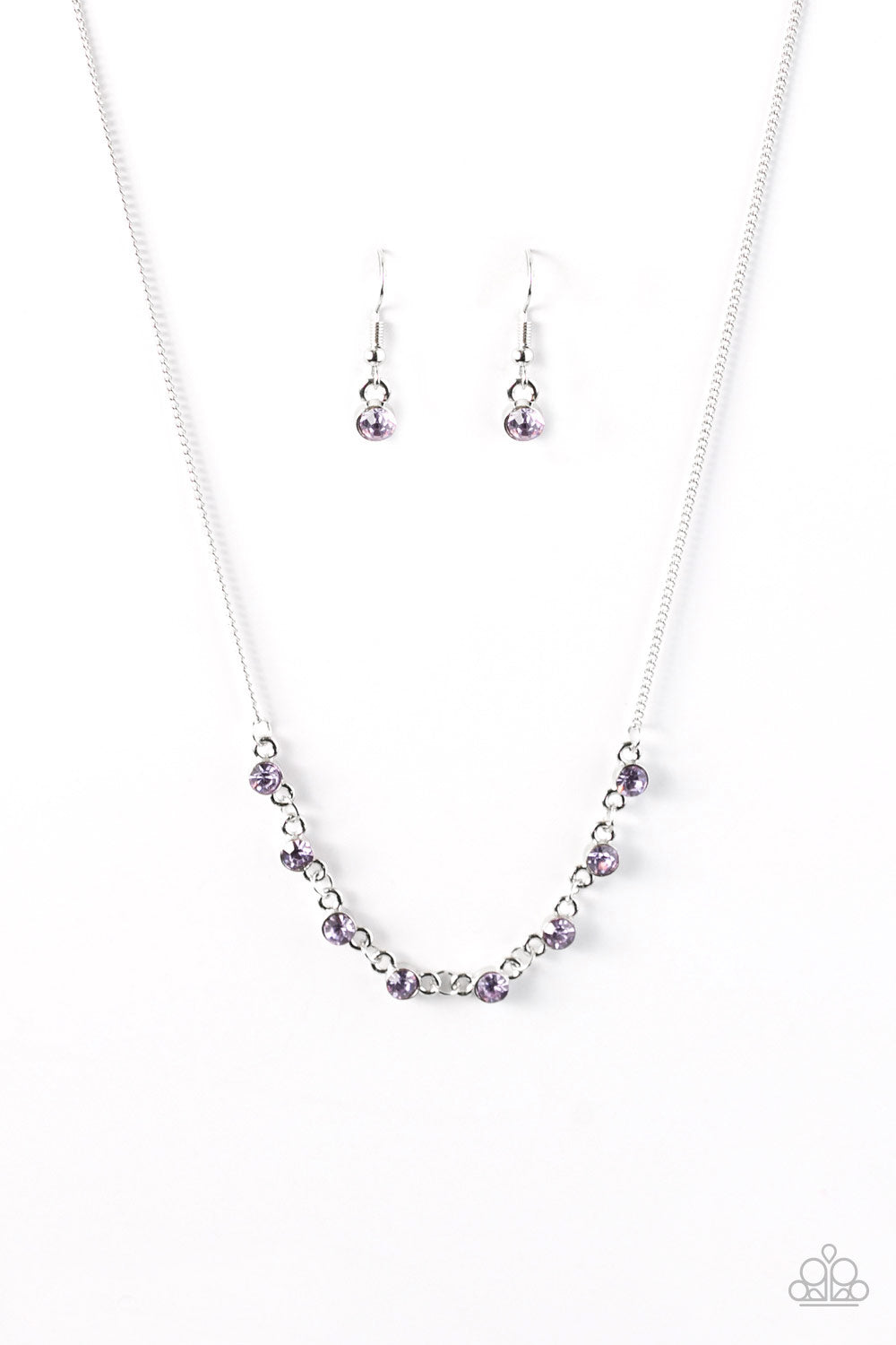 Encased in sleek silver frames, dainty purple rhinestones link below the collar, creating delicate hints of sparkle. Features an adjustable clasp closure.