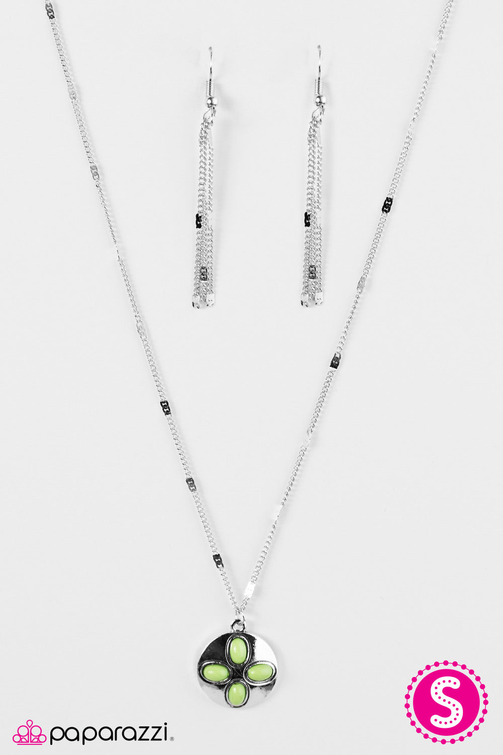 Dainty green stones are pressed into a round silver frame, creating a colorful pendant below the collar in a seasonal fashion. Features an adjustable clasp closure.