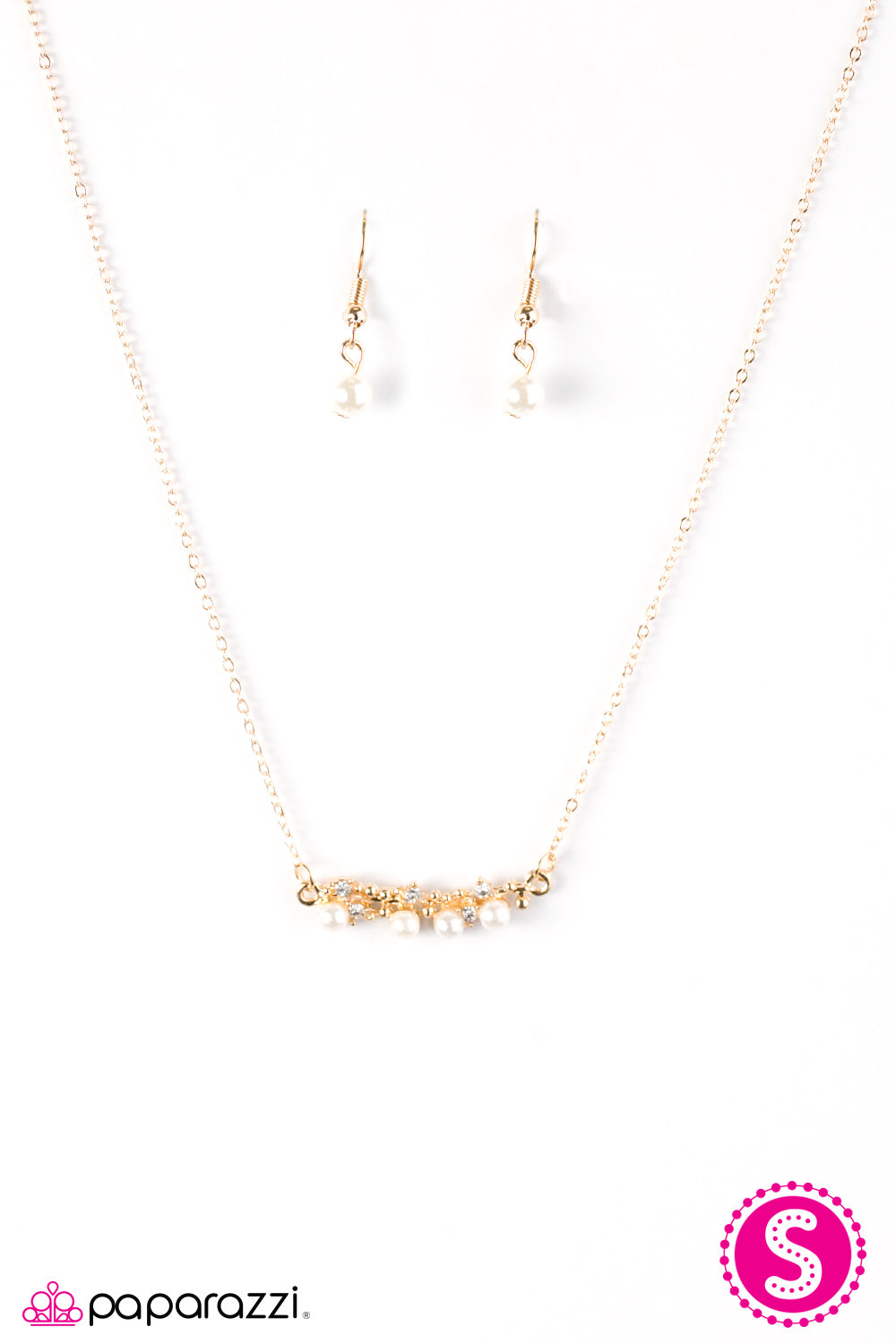 Encrusted in white rhinestones and pearly white beading, a dainty gold pendant falls just below the collar in a refined fashion. Features an adjustable clasp closure.