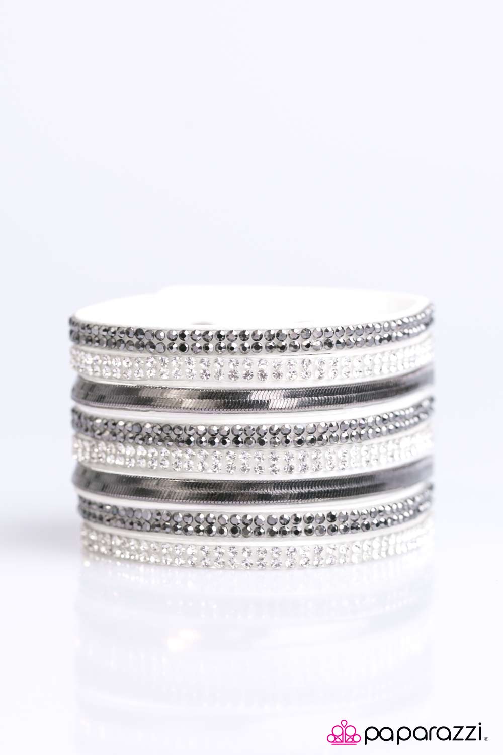 Rows of glassy white and hematite rhinestones stack across the wrist, creating an undeniably glittery palette. Rows of flat gunmetal chain race between the sparkling strands, adding a flashy metallic finish to the collision of texture. Features an adjustable snap closure.