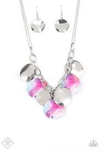 Featuring a galactic tie dye print, flat colorful discs swirled in tones of blue and purple combine with curved silver discs, swinging from the bottom of a bulky silver chain for a trendy throwback look. Features an adjustable clasp closure.