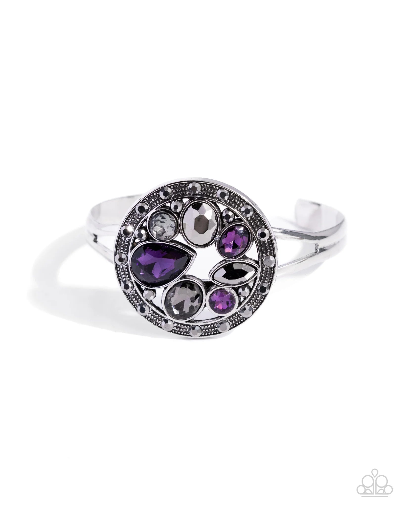 Encircled in a studded silver frame of hematite rhinestones, a mismatched collection of smoky, purple, and hematite gems glitters atop a layered silver cuff for an edgy sparkle.