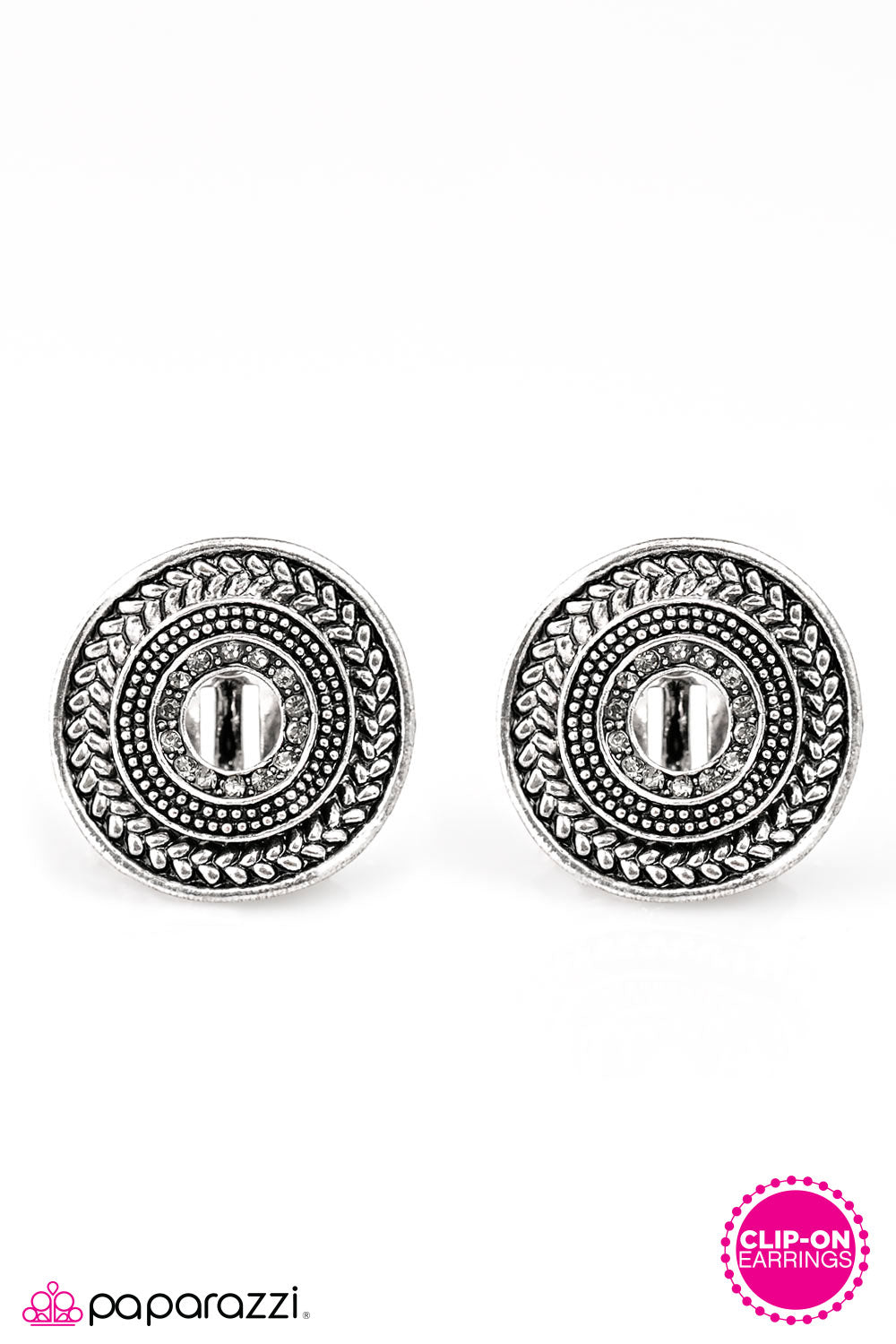 A subtly beveled silver frame spins around a glittery hematite center. Embossed in a mishmash of textures, the radiant display creates a versatile accent piece. Earring attaches to a standard clip-on fitting.