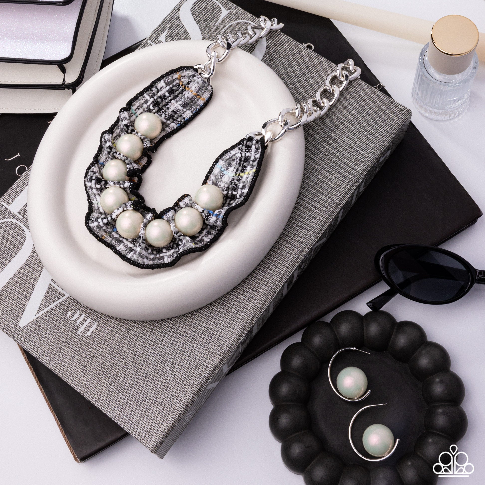 Brushed in an iridescent sheen, a collection of oversized glossy pearls is nestled amongst a thick, black, tweed-inspired strip of fabric that gathers below the neckline from a thick silver chain for a corporate-chic display. Features an adjustable clasp closure.