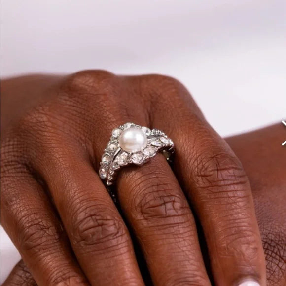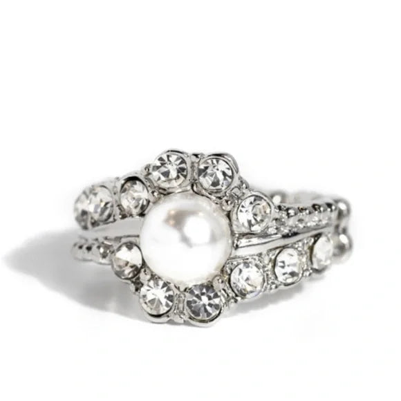 A solitaire pearl, encircled in brilliant white rhinestones set in layered shiny silver bands, creates a glamorous elegance atop the finger. Features a dainty stretchy band for a flexible fit.