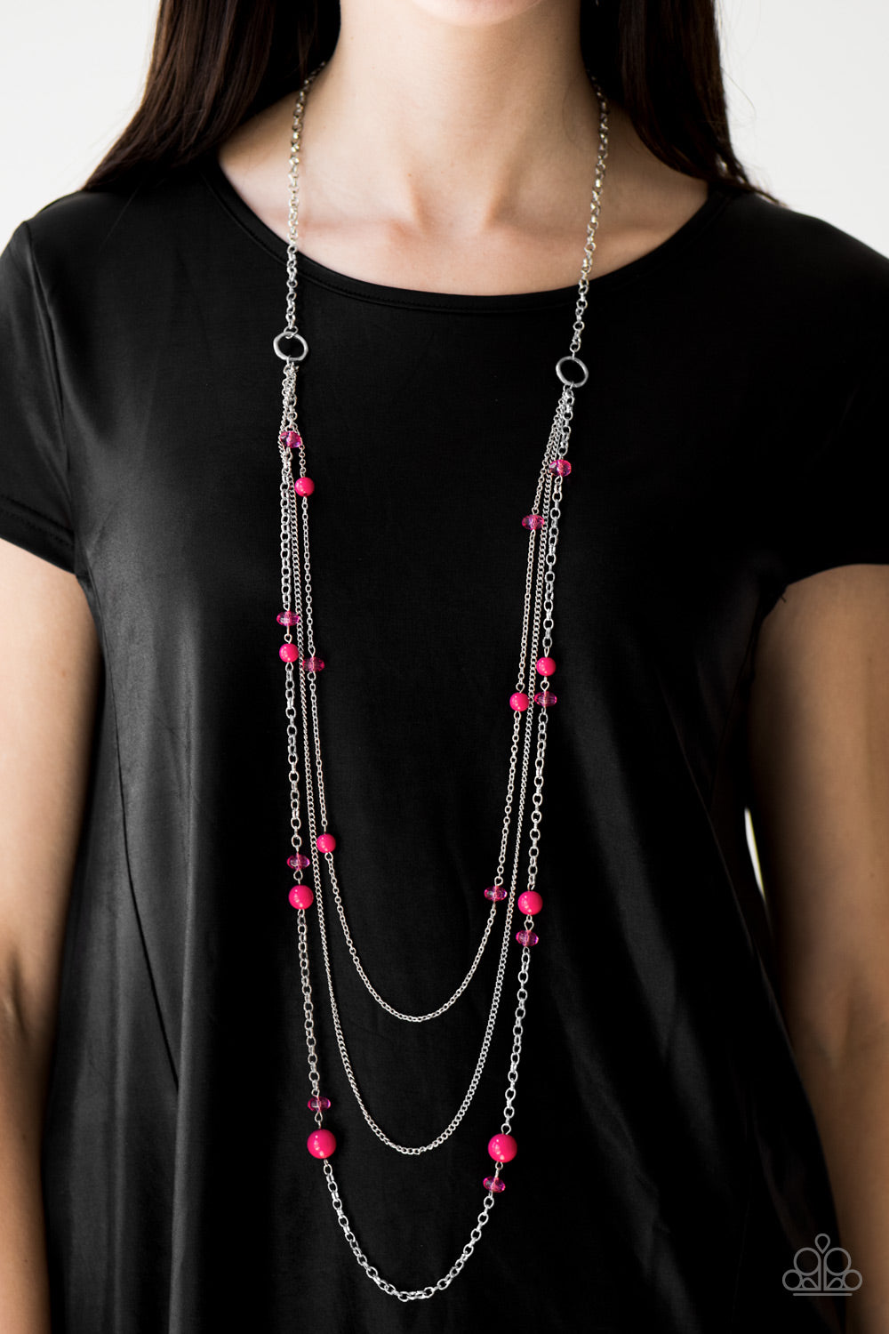 Featuring various sizes and shimmer, three silver chains layer down the chest. Faceted crystal and polished pink beading trickles along the chains, adding a colorful finish to the whimsical palette. Features an adjustable clasp closure.