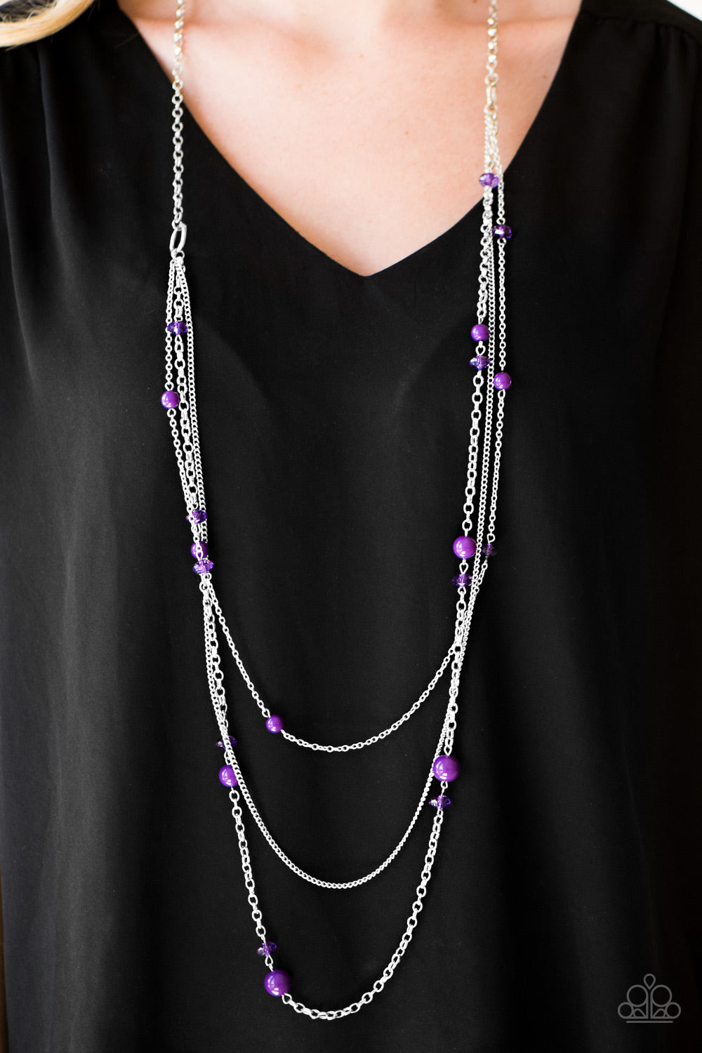 Featuring various sizes and shimmer, three silver chains layer down the chest. Faceted crystal and polished purple beading trickles along the chains, adding a colorful finish to the whimsical palette. Features an adjustable clasp closure.