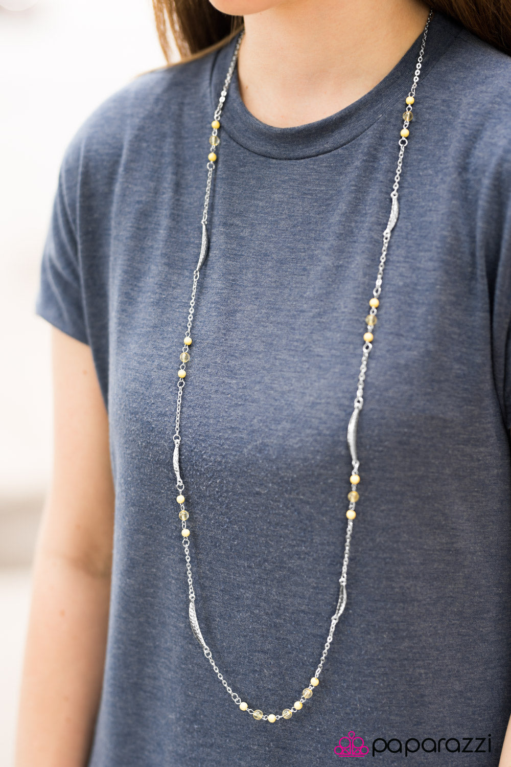 Delicately hammered silver crescents trickle along an elegant silver chain. Dainty yellow beading is sprinkled between the shimmery silver accents, adding a colorful finish to the whimsical palette. Features an adjustable clasp closure.