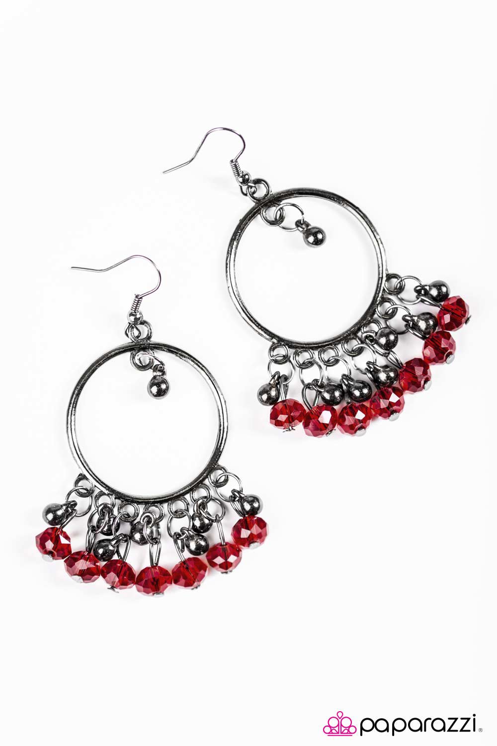 A gunmetal hoop is adorned with metallic gunmetal beads and red translucent beads with faceted edges. Earring attaches to a standard fishhook fitting.