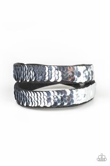 Row after row of shimmery sequins are stitched across the front of a lengthened black suede band. The elongated band allows for a trendy double wrap design. Bracelet features reversible sequins that change from purple to blue. Features an adjustable snap closure.