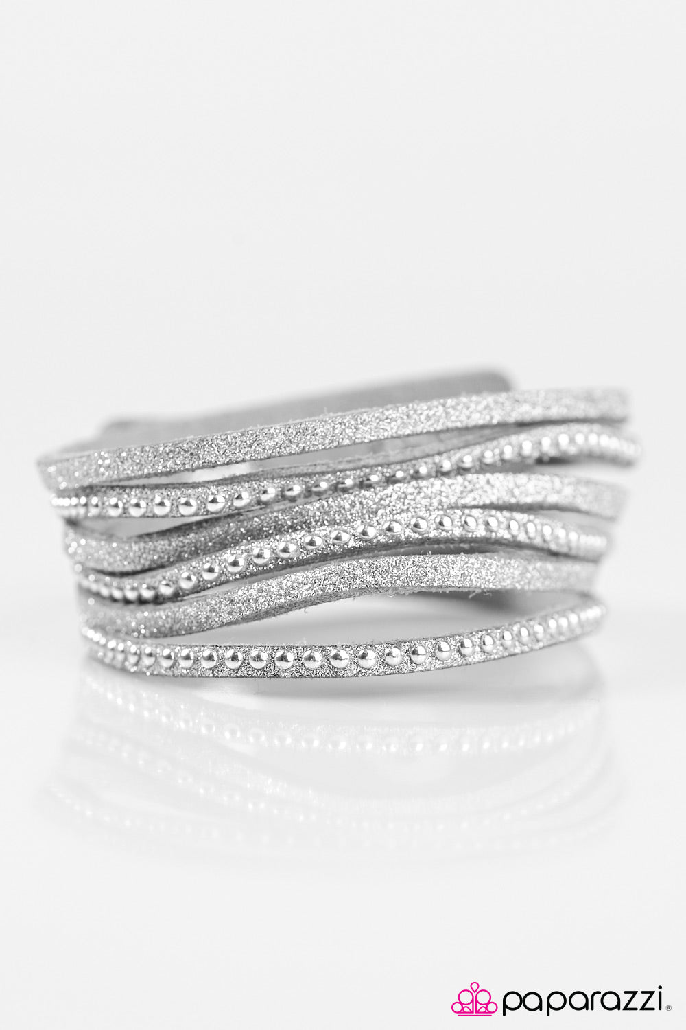 Brushed in glittery metallic finish, a strip of silver suede is spliced into sparkling strands. Dainty silver studs line the strands, adding a flashy finish to the sassy industrial palette. Features an adjustable snap closure.
