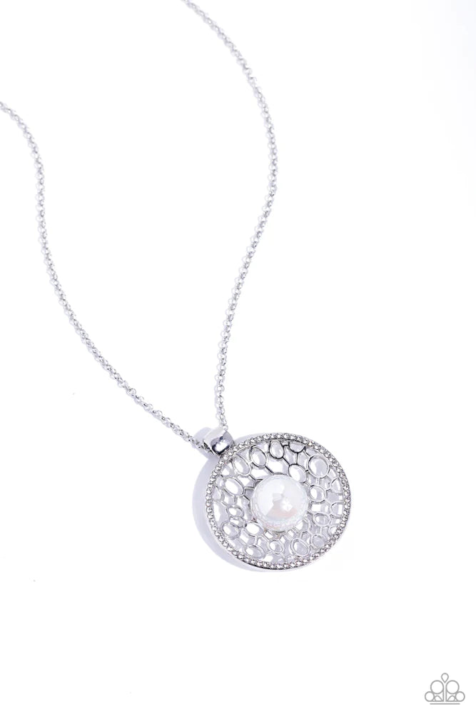 Featuring an iridescent sheen, a white pearl is pressed into a concaved, netted silver disc for a standout centerpiece. A border of white rhinestones is dusted around the abstract pendant for a touch of glitz to the design. Features an adjustable clasp closure. Due to its prismatic palette, color may vary. Sold as one individual necklace.