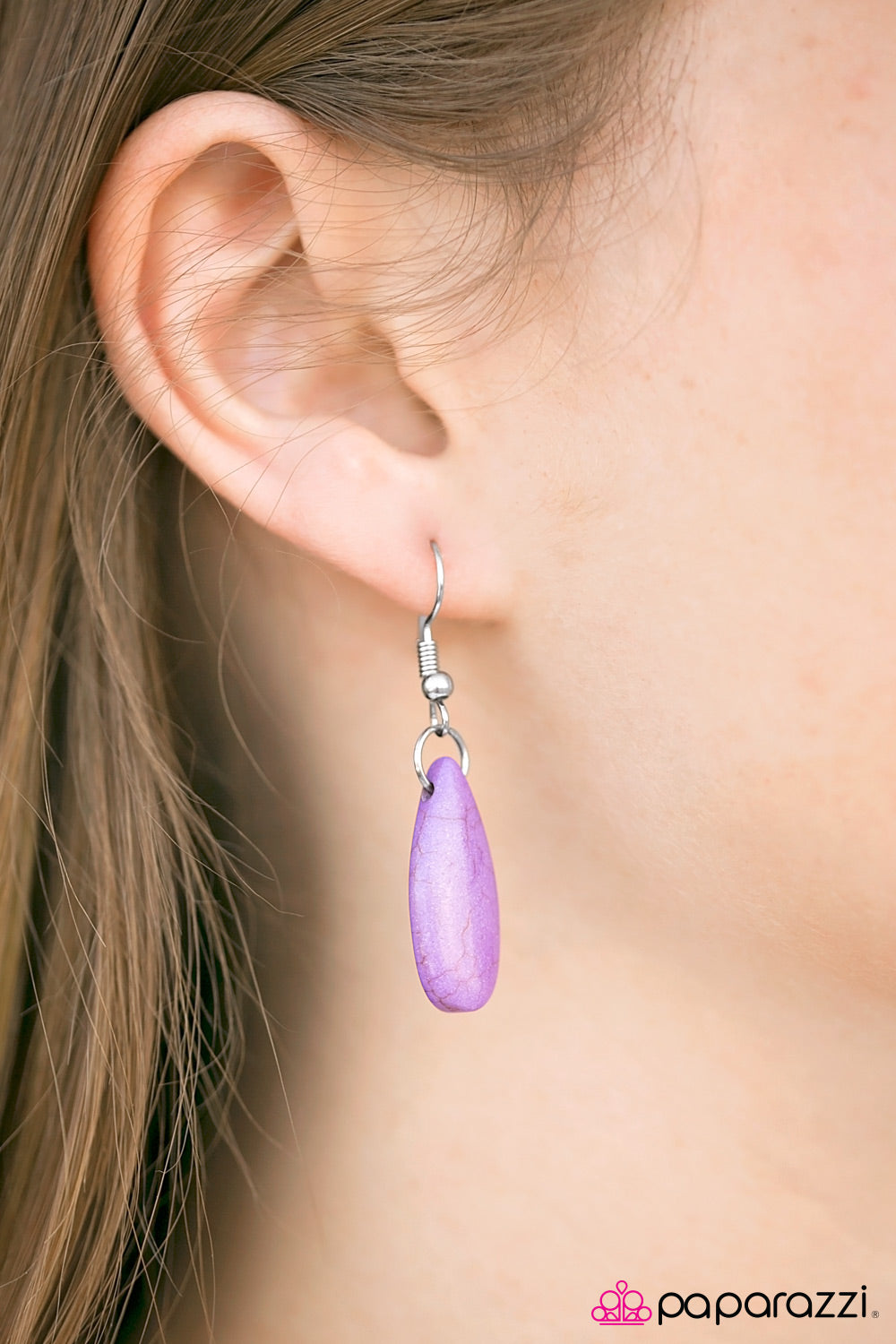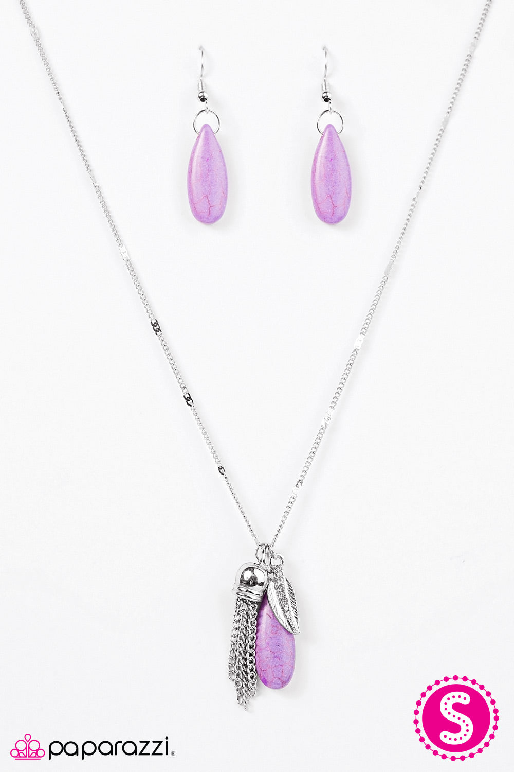 A silver tassel, teardrop purple stone, and a silver feather encrusted in dazzling white rhinestones swing from the bottom of a silver chain, creating a whimsical pendant below the collar. Sections of the silver chain have been hammered for extra shimmer. Features an adjustable clasp closure.
