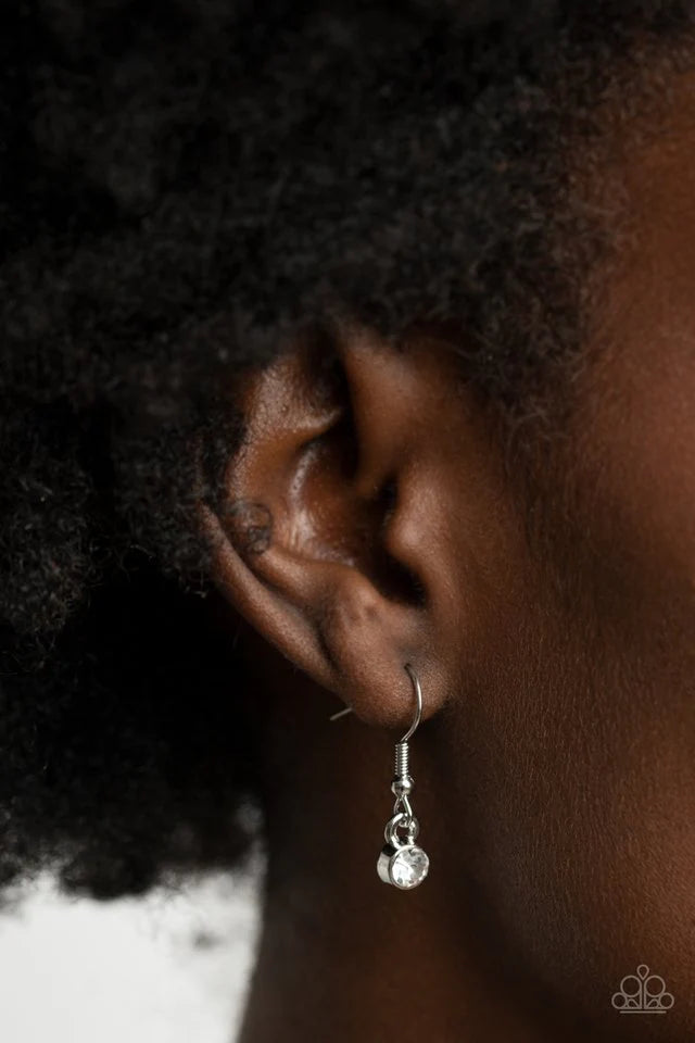 Bordered in glassy white rhinestones, a faceted blue bead dotted frame gives way to a curtain of shimmery silver chains, creating a glamorous pendant.