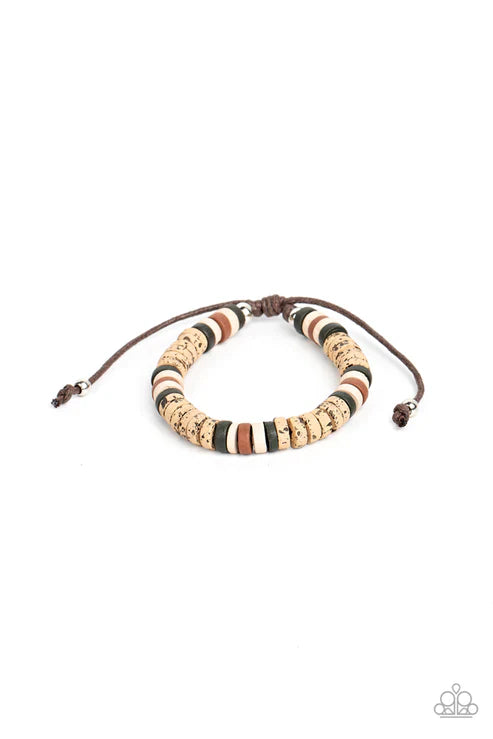 An earthy collection of green, white, brown, and speckled wooden discs are threaded along a brown cord around the wrist for an adventurous pop of color. Features an adjustable sliding knot closure.