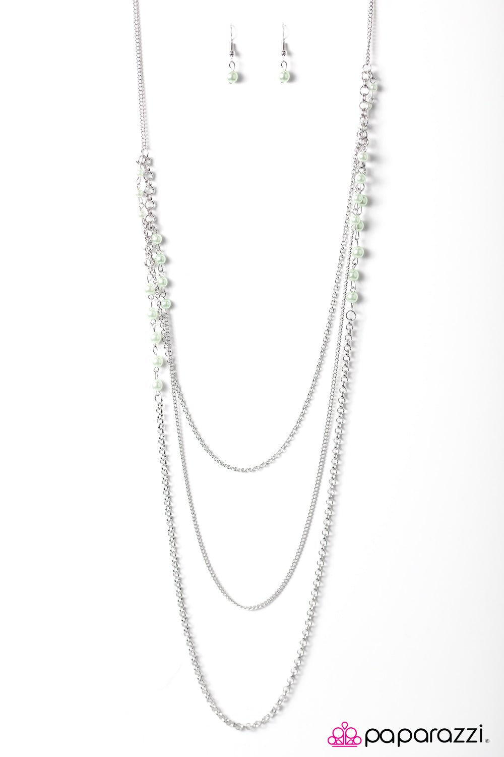 Dainty green pearls are sporadically sprinkled along trestles of shimmering silver chain. Infused with an elegant elongated silver chain, the layered palette dramatically falls down the chest in a refined fashion. Features an adjustable clasp closure.
