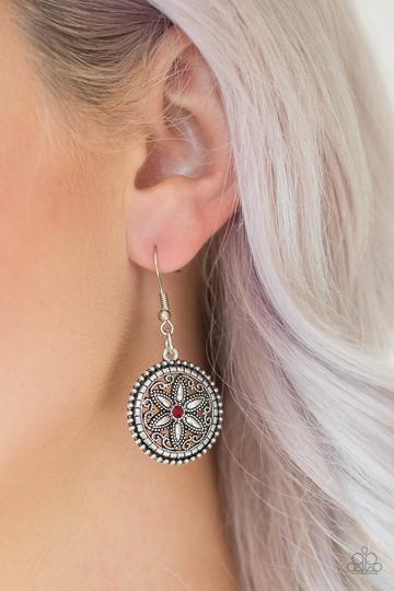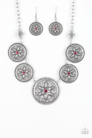 Dotted with glittery red rhinestone centers, floral silver frames gradually increase in size as they link below the collar for a whimsical look. Features an adjustable clasp closure.