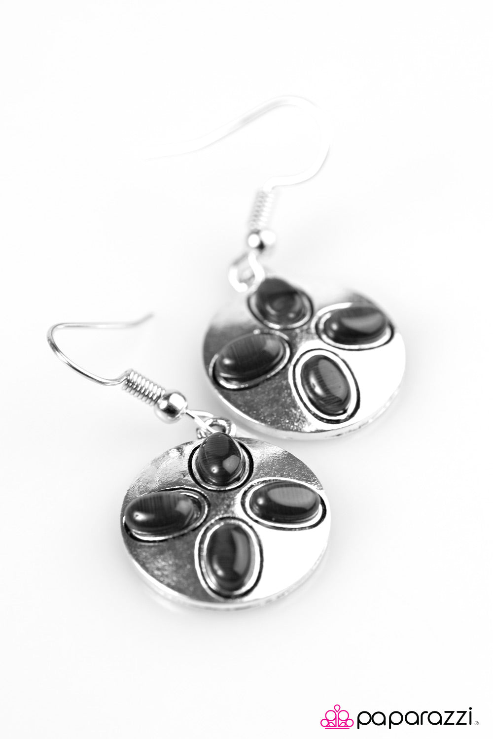 Luminescent black moonstones are pressed into a silver frame, creating a whimsical lure. Earring attaches to a standard fishhook fitting.